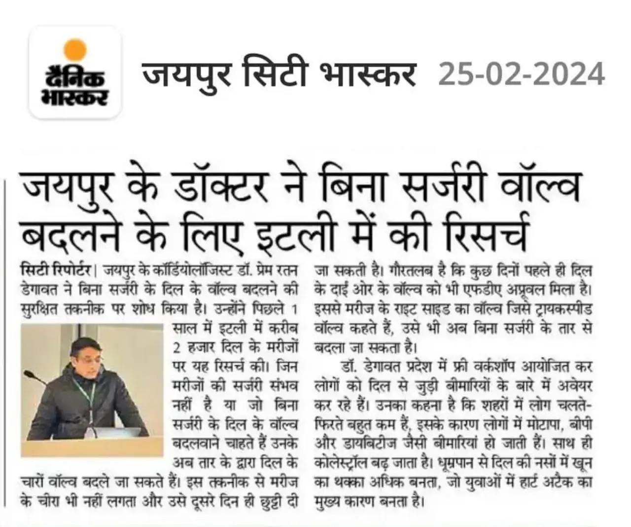 He addresses a broad spectrum of structural heart conditions, from heart valve replacement to complex coronary interventions and advanced heart failure management. Dr. Prem Ratan Degawat is your trusted heart valve replacement surgeon in Jaipur, offering expertise and compassionate care to patients seeking optimal heart health. - Commitment to Patient Care: